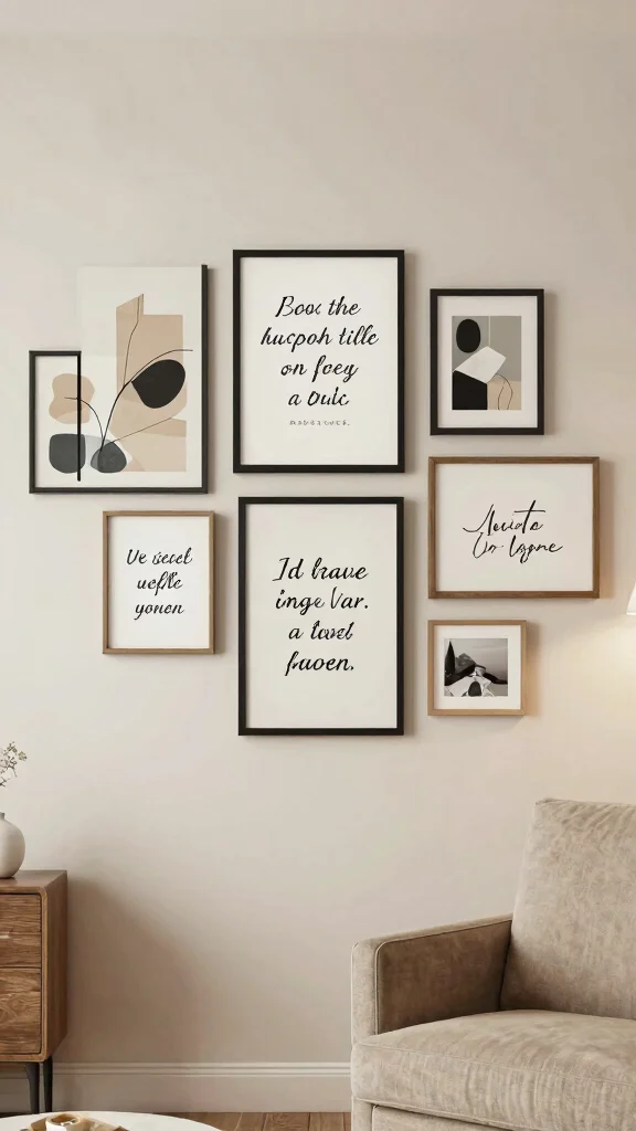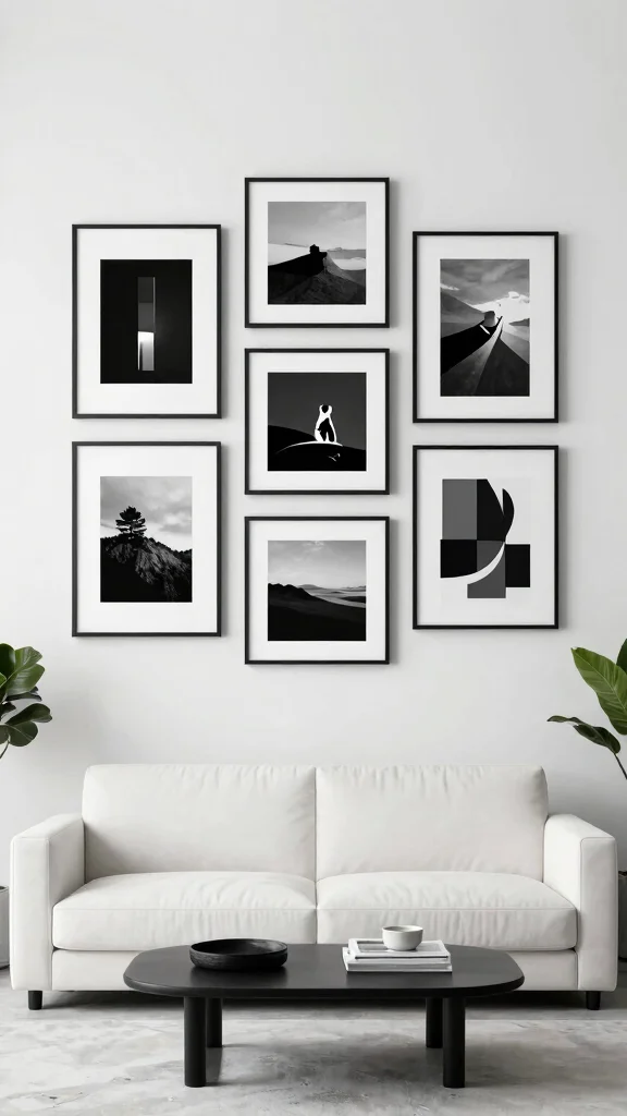 If you’re aiming for a chic and sophisticated aesthetic, a minimalist black and white theme is the way to go. This design allows for a sleek gallery wall that feels fresh and clean, showcasing a mix of photography, abstract art, and quotes all framed in black and white. The beauty of this approach lies in its simplicity, making it easy to update your collection without needing a complete overhaul.