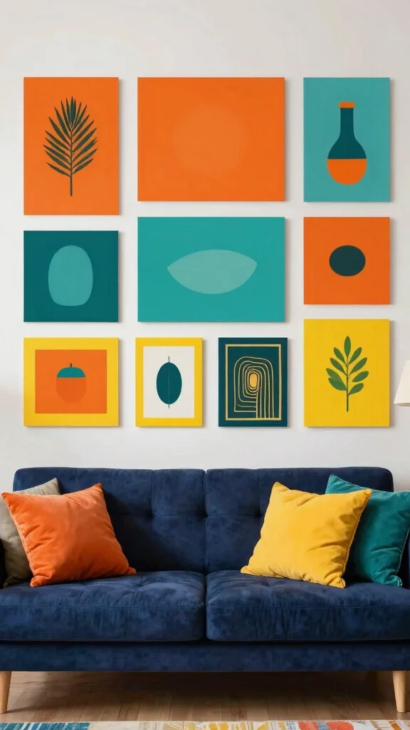 Color blocking is a lively and creative way to showcase wall art that brings energy to your living room. This design involves selecting artworks in two or three complementary color palettes, arranged to form a cohesive visual statement. This playful technique can make a bold impression without overwhelming the space.