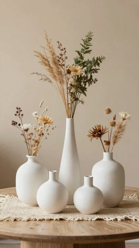 Aim for rhythm and restraint: use an odd-number grouping of vases at different heights, then add greenery with airy textures like eucalyptus or dried grasses. Keep the color palette calm to align with neutral home decor and let the shapes lead the eye in white vase arrangements. Avoid overcrowding—space is part of the design, so give each piece room to breathe and shine with ceramic vase styling.
