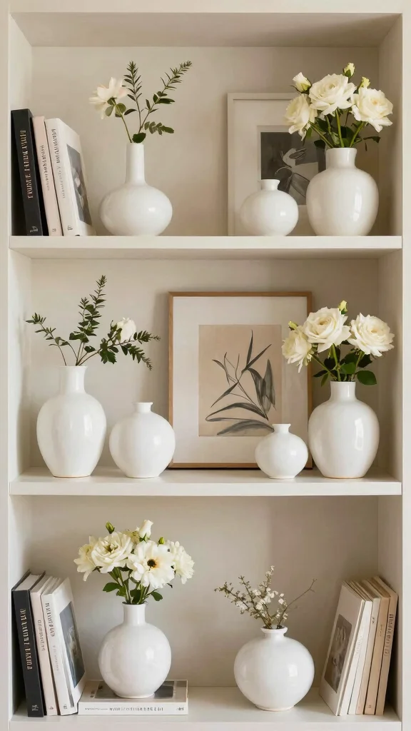 Integrating white ceramic vases into your shelving can elevate the aesthetic while remaining functional. Position them alongside books, framed photos, or small sculptures to build a balanced visual narrative. The simplicity of these vases contrasts beautifully with darker books or colorful decor, ensuring everything stands out.