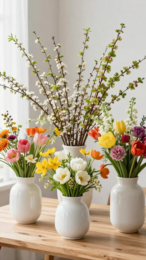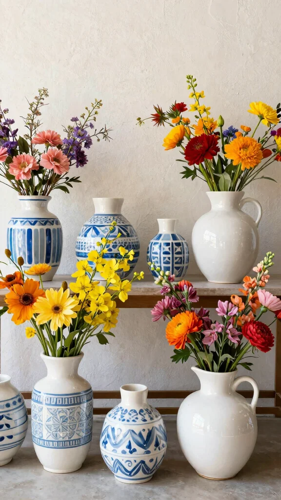 Here are some tips: Use vases of varying heights to create dynamic arrangements. Choose colors that reflect the season, ensuring they pop against the neutral vases.