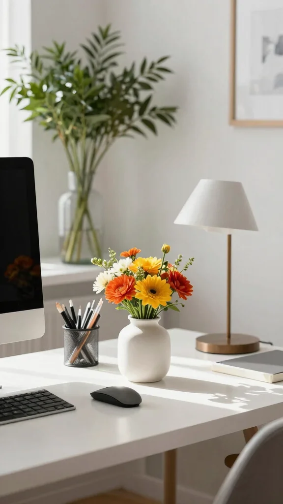 Consider these styling tips: Choose low-maintenance plants for desks to keep things functional. Update floral arrangements regularly to maintain a fresh feel.