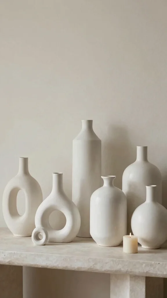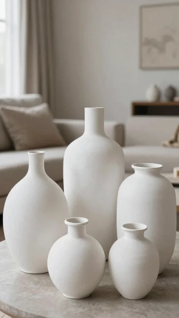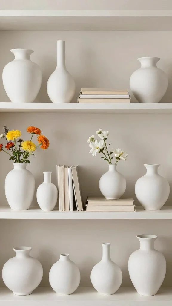 Choose one striking white ceramic vase as a focal point on shelves or tables to draw attention.