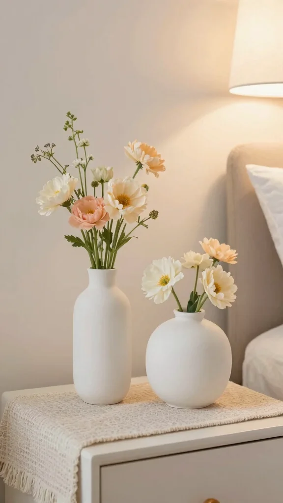Consider placing a larger vase on one side of the bed and a smaller one on the other to create balance. This not only adds interest but maintains a clean, minimalist aesthetic. A textured runner under the vases can enhance the cozy feel.