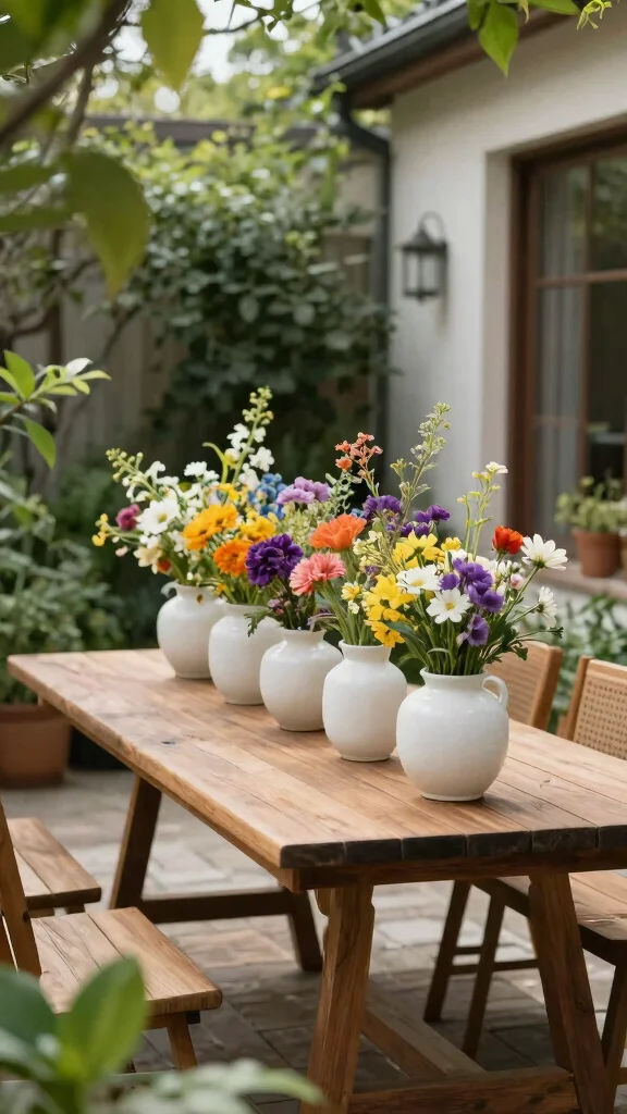 To ensure style and functionality, consider vases designed for outdoor use, or protect indoor ones from weathering. A cluster of vases can form a charming centerpiece for your outdoor dining table.