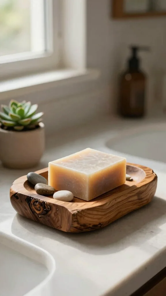 Wood bathroom accessories bring warmth and personality into any space. Small wooden trays and carved art from reclaimed wood offer practical organization and a natural focal point. Refresh your vibe by swapping pieces—it’s an easy, eco-friendly upgrade!