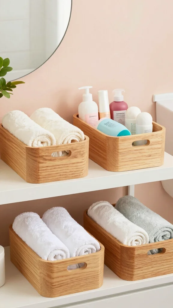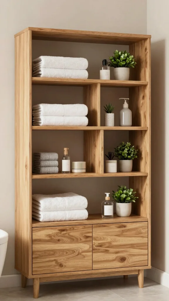 Opt for wooden storage solutions that mount on the wall or stack vertically. Think wall-mounted racks, a slim under-sink shelf, or a corner caddy made from light wood. Use natural bathroom decor to tie in, with baskets woven from rattan or jute for contrast. Choose compact designs with rounded edges to avoid crowding the space. Label and group items to reduce clutter, and consider multi-purpose pieces like a wooden stool that doubles as a storage box.