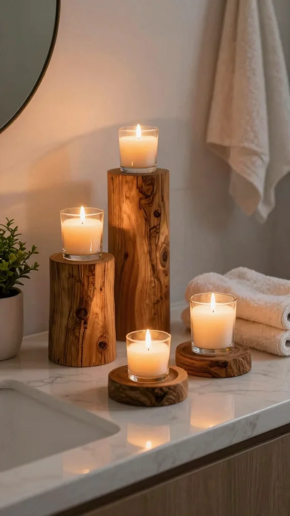 Elevate your bathroom’s ambiance with wooden candle holders that create a warm, inviting atmosphere. Available in various shapes and sizes, these holders allow you to mix and match for a curated look. Opt for ones made from reclaimed wood to support sustainable practices while enjoying a unique item that enhances your decor.