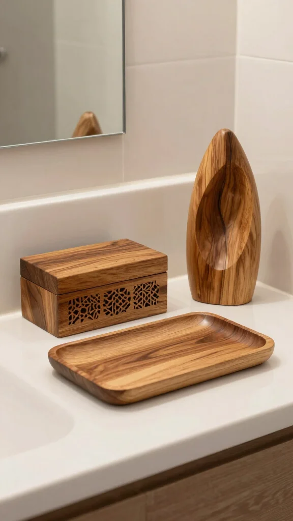 Utilize small wooden trays for organizing items on your vanity or shelves, and consider carved wooden art or sculptures that serve as focal points, echoing the natural theme of your space.