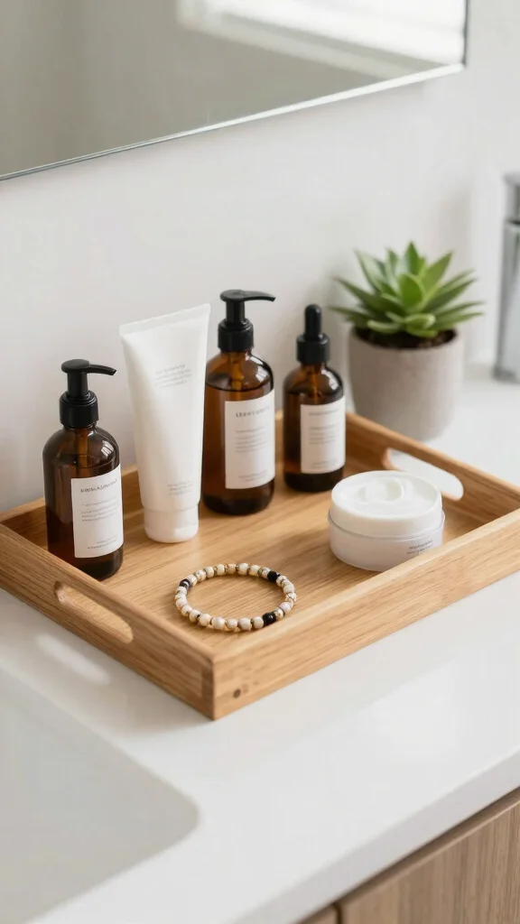A wooden vanity tray is a beautiful way to organize your bathroom essentials while adding a touch of nature. Use it to corral skincare products, jewelry, and other small items that can clutter your countertop. A tray made from reclaimed wood not only promotes eco-friendly practices but also showcases a unique character through its imperfections.