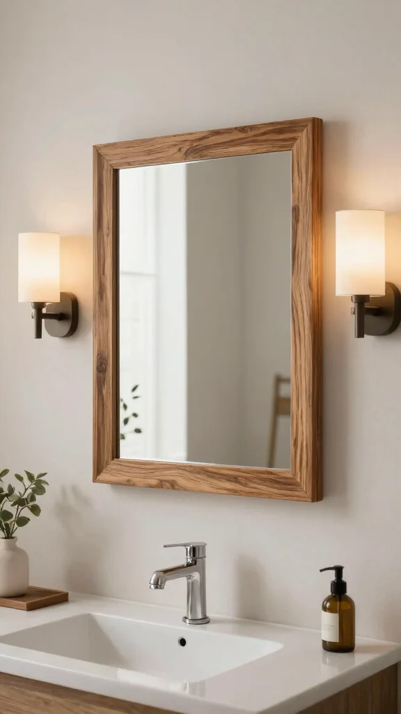 Pro tip: A wooden bathroom mirror frame made from reclaimed wood elevates your wood bathroom accessories with warmth and depth. Round frames soften the look, while sleek rectangular ones keep things modern—pair with eco-friendly lighting for a cozy, sustainable bathroom that still feels chic.