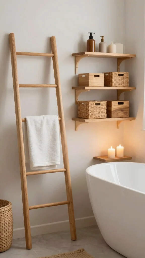 A wooden towel ladder adds a delightful blend of functionality and artistry to your bathroom. This stylish accessory not only provides practical towel storage but also introduces vertical interest, making your space feel larger and more inviting. Opt for sustainable wood to enhance your eco-friendly decor while embracing a rustic aesthetic.